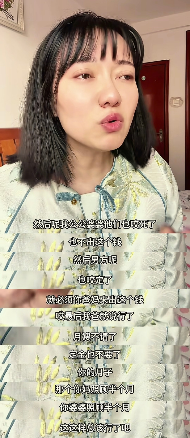 万万莫得意想,公公婆婆也不肯意出这个钱,然后我方的爸爸就绝顶未可厚非,就说,内行吵来吵去皆以为哪个付这个钱皆不对理,干脆就这么吧,就前边的定金也不要了,也不请月嫂了,就一个东谈主蔼然半个月,前边的半个月由孩子的外婆来蔼然,背面的半个月由孩子的奶奶来蔼然,这格式也无须请月嫂了,也无须吵了。